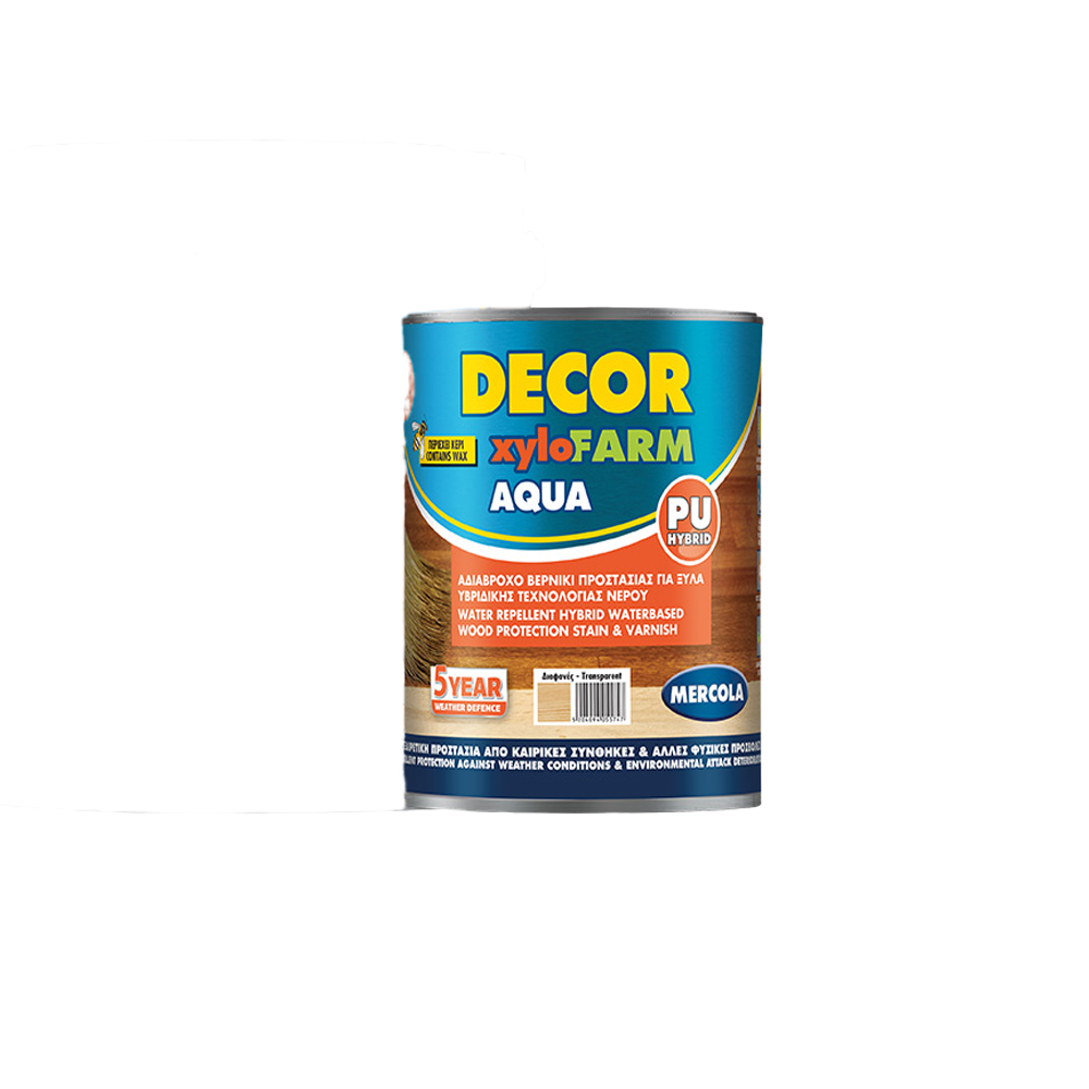 DECOR XYLOFARM AQUA is a waterbased wood stain varnish based on a new hybrid polyurethane and acrylic technology. It is environmentally and user friendly. Due to a special formula based on a blend of waxes and new technology special waterbased resins it penetrates deeply into the wood protecting it against common environmental attacks. Contains UV filters for effective protection from exposure to the sun ultraviolet rays. It is water repellant, protects wood from discoloration, blue stains, and deterioration. Does not peel, crack or blister and it is highly elastic. Offers effective protection from all weather conditions and enhances wood’s natural beauty. Due to its ingredients, protects the dry film from fungus growth especially in areas exposed to high humidity or/and adverse weather conditions. It is suitable for interior and exterior use. It is available in transparent and many natural shades of wood.